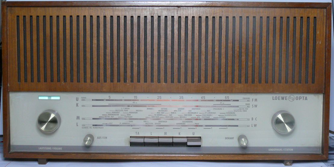 Dieses hübsche Gerät wurde bei Loewe Opta gefertigt und in Berlin verkauft. Der Aufkleber auf der Rückwand verrät uns das. Offenbar hatte dieses Röhrenradio noch keine schlechten Erfahrungen mit Menschen gemacht und so ließ es sich bereitwillig verarzten. Der AM- Empfang funktionierte. FM- Empfang war nicht möglich. Die ECC85 im Tunerteil war in Ordnung. Heiz- und Anodenspannung wiesen die üblichen Werte auf. Ein eingekoppeltes 10,7 MHz ZF-Signal war gut zu hören. Der FM-Tuner brachte kein Ausgangssignal. Das Chassis mußte aus dem Gehäuse ausgebaut werden, um die Abschirmkappe des Tuners zu demontieren. Mit einem lose an die selbstschwingende Mischstufe angekoppelten Frequenzzähler ließen sich keine Schwingungen nachweisen. Nach Austausch des keramischen Kondensators für die Rückkopplung lebte der Tuner wieder. Das solch ein Kondensator im unteren pF- Bereich seinen Geist aufgibt ist rel. selten.
