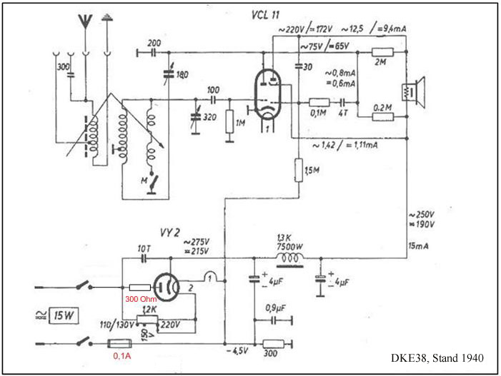 Dieser Deutsche Kleinempfänger 38 (DKE38) gehört zum Adlershofer Requisitenfundus. Als weitverbreiteter Kleinempfänger darf er in keiner Sammlung fehlen. Das Gerät wurde für "Jedermann" produziert und kostete 35,-RM. Das hier vorgestellte Gerät war in einem erbärmlichen Zustand. Neben einer dicken Schmutzkruste auf dem Chassis und den Bauteilen wies das Exemplar folgende Mängel auf : Fehlendes Netzanschlusskabel, Hebel vom Netzschalter abgebrochen, Lade- und Siebkondensator vom Netzteil defekt, die VCL11 hatte einen Systemschluß zwischen der Anode vom Triodensystem und dem Schirmgitter des Tetrodensystems, Anschlußdraht vom Rotor des Abstimmdrehkondensators abgerissen, die schwenkbare Antennenankoppelspule war von der Betätigungsachse abgerissen, an der Langwellenspule war ein Drähtchen direkt am Kreuzwickel abgerissen.