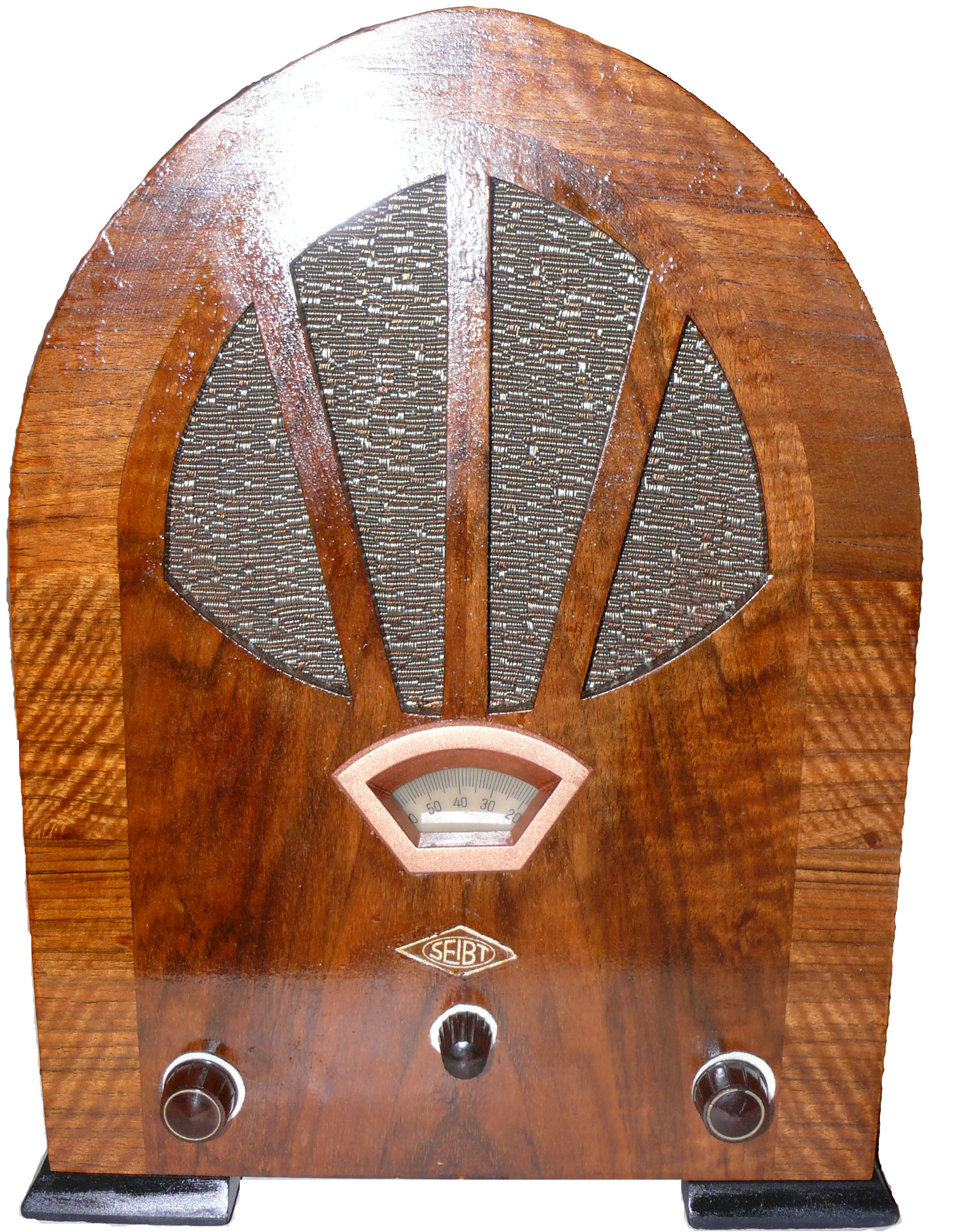 Dieses formschöne Röhrenradio von Seibt, Baujahr 1932 ist das älteste Gerät innerhalb des Requisitenfundus Berlin- Adlershof. Der Zustand war sehr bedauernswert. Netzschnur abgeschnitten, Netzschalter kaputt, Netztrafo durchgeschmort und die Rückwand nur ein Stück Preßspan, die Röhren fehlten und der Friktionsantrieb des Drehkondensators war ohne Funktion. Der Holzrahmen zur Befestigung der Rückwand fehlte zur Hälfte. Die Originallackierung wies an vielen Stellen Risse auf, vor allem an der Frontseite.Die Verdrahtung war erfreulicherweise weitestgehend unversehrt.Bei der Restauration des Holzgehäuses ging ich wie folgt vor: