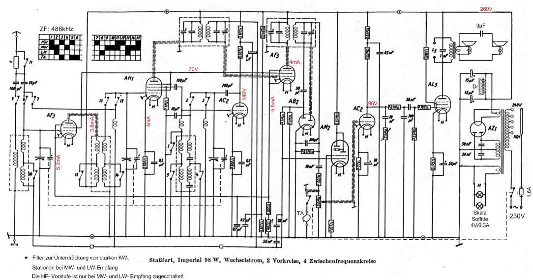 Unter dem Chassis mußten nur wenige Bauelemente gewechselt werden. Drei Wickelkondensatoren und ein Niedervoltelko. Die zweite Inbetriebnahme war auch nicht sehr glücklich. Der Empfänger war völlig unempfindlich. Irgendwann kam ich auf die Idee das Wellenschalterdiagramm mit dem realen Schalter zu vergleichen. Zuerst entdeckte ich, daß es zwei Schaltpläne vom 98W gibt mit völlig unterschiedlichen Schalterdiagrammen. Den Schaltplan für das vorliegende Modell fand ich schnell heraus. Der Wellenschalter hat 3 Segmente. 1. Segment, Kontakt 1-5; 2.Segment, Kontakt 6-11; 3. Segment, Kontakt 12-15. Gezählt wird vom Chassisrand nach innen. Während die ersten beiden Schaltsegmente sich so verhielten wie im Diagramm angegeben, stimmte die Schaltfolge des 3. Segments überhaupt nicht. Nach einer Weile löste sich auch dieses Rätsel. Segment 3 läßt sich auf der Wellenschalterachse verdrehen. Dazu gibt es im Nockensegment ein Loch. Im Netzteilchassis (linkes Bild) habe ich noch eine Spannungsverdoppler- Schaltung, bestehend aus 2 Kondensatoren 0,22µF/630V und 2 Siliziumdioden mit 400V Sperrspannung untergebracht (rote Blochkondensatoren). Die AM2 war schon recht dunkel. Bei der Erhöhung der Leuchtschirmspannung sollte man behutsam vorgehen. Die Auslenkempfindlichkeit sinkt bei Erhöhung der Leuchtschirmspannung. Im vorliegenden Fall reichten 300V für einen guten Kompromiß.
