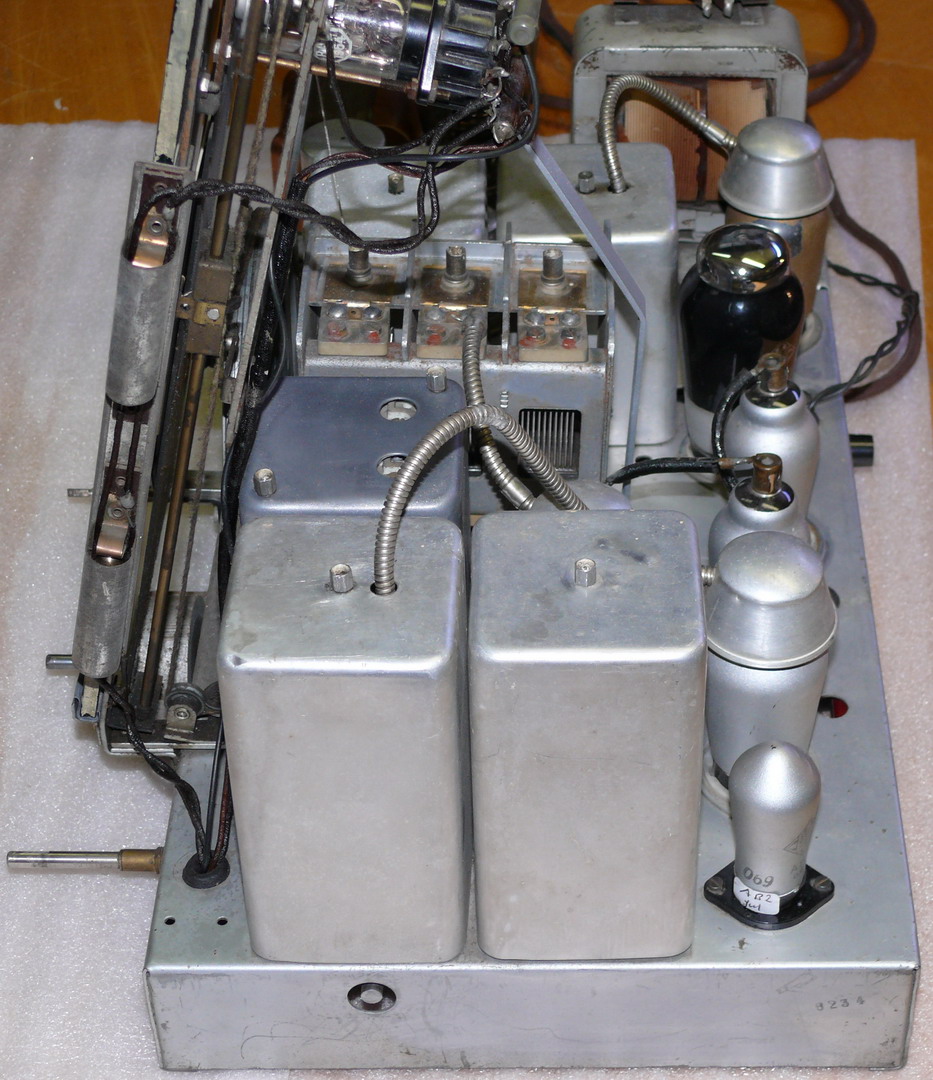 Da die bereitgestellte Gleichspannung aus dem Netzteil eine sehr hohe Welligkeit aufwies, wurden Lade- und Siebelko untersucht. Bei Einem "fraß" sich das Elektrolyt durch den Aluminiumbecher. Die Restströme lagen bei 15 und 25mA. Den großen Elko mit noch erhaltener Beschriftung habe ich verjüngt (radial den Alubecher 1,5cm vom unteren Ende mit dem Abstechmeißel auf der Drehbank abgetrennt). Das Innenleben komplett entfernt und zwei in Reihe geschaltete Elkos 33µF/350V eingebaut. Zur Symetrierung wurden die Elkos mit je einem 220kOhm Widerstand überbrückt. Die beiden Alubecherteile werden mit einer Schelle zusammengehalten. Die Schelle nimmt mit einer Lötfahne den Minuspol auf. Der Siebelko und der 8µF- Elko im Anodenkreis der Oszillatorröhre wurden durch gut erhaltene und formierte Elkos von RFT (50er Jahre) ersetzt.