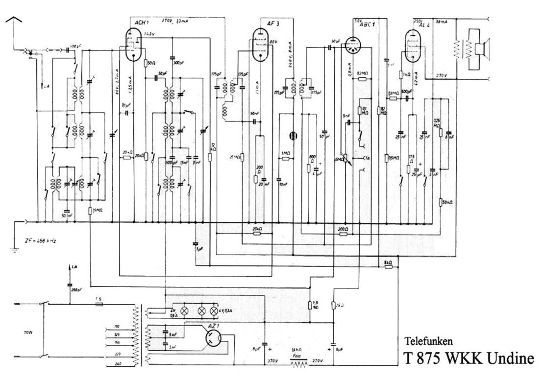 Dieses schöne Radio mit seiner modernen Formgebung gehört zum Adlershofer Requisitenfundus. Das linke Bild zeigt das Chassis im ausgebauten Zustand. Ein Teil der Röhren fehlte. Ziel war das Gerät wieder in einen empfangsbereiten Zustand zu versetzen. Nach einer Grundreinigung und der Beschaffung der fehlenden Röhren konnten die einzelnen Röhrenstufen einer Prüfung unterzogen werden. Zuerst das Netzteil. Nach Austausch der Netzanschlußschnur nahm ich das Gerät über einen Trennregeltrafo in Betrieb. Die Netzspannung dabei langsam bei 150V beginnend auf 230V hochgeregelt. Lade- und Siebkondensator (noch original) erwiesen sich als spannungsfest und hatten einen Reststrom von unter 3mA rückläufig. Der "Grundbrumm" im Lautsprecher erschien mir normal.